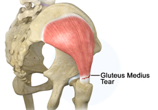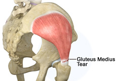 A gluteus medius tear is a condition characterized by severe strain on the gluteus medius muscle that results in partial or complete rupture of the muscle.